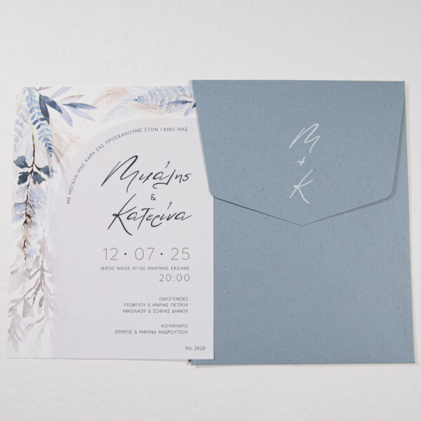 Η τιμή χρέωσης αφορά τον φάκελο ο οποίος είναι από exclusive ιβουάρ χαρτί, κλείνει με βουλοκέρι και η κάρτα είναι σε μπλε ραφ χαρτί 250γρ.