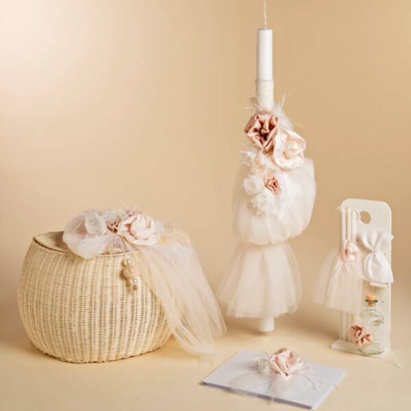 Ψάθινο καλάθι με χειροποίητα λουλούδια και μεγάλα φτερά, λαμπάδα με πλούσια τούλια στο χρώμα της πούδρας, κεραμικές χάντρες και κορδονέ δαντέλες. Συνδυάζονται αρμονικά ευχολόγιο, μπουκάλι λαδιού, κεράκια , σαπουνάκι και ολοκληρώνουν αυτό το ρομαντικό πακέτο.