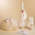 Η αρχοντιά του λευκού και η αριστοκρατική δαντέλα συνδυάζονται άψογα ώστε να έχουμε ένα ιδιαίτερο πακέτο. Δερμάτινη τσάντα με πλούσιο στολισμό από δαντέλες και τούλια, σεταρισμένη με λαμπάδα, σέτ λαδιού και ευχολόγιο. Ιδιαίτερο χαρακτηριστικό του πακέτου τα ρομαντικά πούπουλα και οι μεγάλες πέρλες.