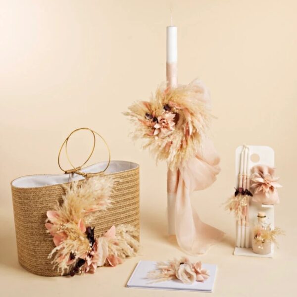 Ένα πακέτο με μπόχο διάθεση, έντονα χρώματα, φυσικά pampas, υφασμάτινα λουλούδια και μουσελίνες κάνουν το αποτέλεσμα ξεχωριστό. Ψάθινη τσάντα με πλούσια σύνθεση, λαμπάδα με στεφάνι πλεγμένο από αγριολούλουδα, ευχολόγιο και σέτ λαδιού ολοκληρώνουν το αποτέλεσμα κάνοντας τη στιγμή σας μοναδική.