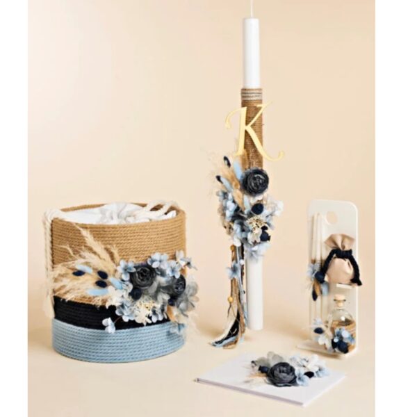 Υφασμάτινα λουλούδια, φυσικά pampas και κορδόνια σε μπλε σιέλ και σπαγγί χρωματισμούς, ξύλινο στρογγυλό καλάθι με πλούσια σύνθεση από λουλούδια. Ασορτί λαμπάδα με μεγάλο μονόγραμμα Plexiglass της επιλογής σας. Σέτ λαδιού σε ξύλινη βάση και βιβλίο ευχών ολοκληρώνουν το πακέτο αυτό.