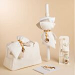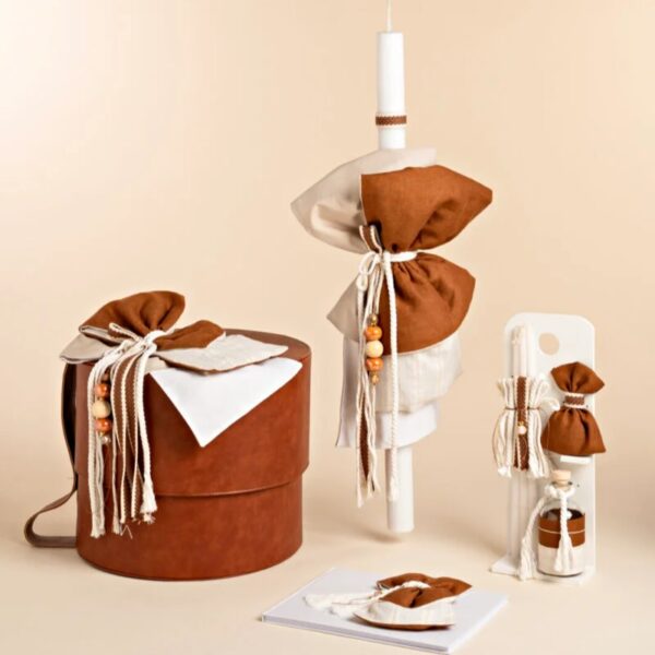 Ένα πακέτο σε αποχρώσεις του μπέζ και του σαφράν με υφάσματα, κορδόνια, ξύλινες χάντρες και βαμβακερούς ιμάντες, λαμπάδα, σέτ λαδιού και βιβλίο ευχών, στολισμένα αριστοκρατικά, για τις πιο γλυκές στιγμές.