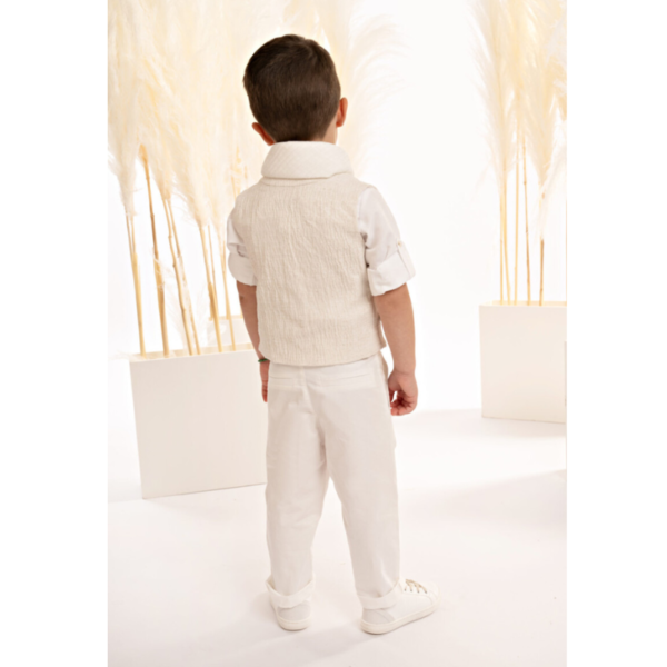 Ένα σύνολο που αποπνέει φινέτσα και σύγχρονη minimal αισθητική. Παντελόνι από λευκή βαμβακερή καμπαρντίνα που ξεχωρίζει για τη μοναδική λεπτομέρεια στο ζωνάκι και γιλέκο, με λοξό ασύμμετρο κόψιμο και εξωτερικό τσεπάκι, από μπεζ  γκοφρέ μελανζέ cotton-lino ύφασμα. Το βαμβακερό πουκάμισο mao με τον ιδιαίτερο γιακά σε off white απόχρωση συμπληρώνει το σύνολο ενώ το υπέροχο πλισέ φουλάρι στην ίδια απόχρωση χαρίζει αίσθηση αβίαστης κομψότητας. Το outfit ολοκληρώνεται με ψάθινο καπέλο ή τραγιάσκα (ανάλογα με την προτίμηση), προσθέτοντας την τελική πινελιά σε αυτό το σύγχρονο και κομψό σύνολο.