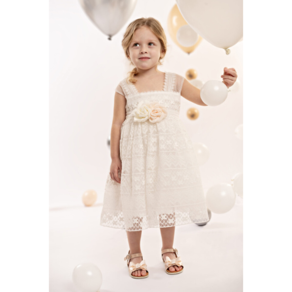 Ένα ονειρεμένο αμπίρ φόρεμα σε λευκό χρώμα, με μπούστο φτιαγμένο από δαντέλα και φαρδιές τιράντες από micro πουά τούλι. Η φούστα με πλούσιες σούρες από δαντέλα και glitter τούλι χαρίζει αέρινη κίνηση και λάμψη. Η ζώνη από τούλι, που δένει πίσω, στολίζεται υπέροχα με δύο χειροποίητα διακοσμητικά τριαντάφυλλα από σατέν σε ροζ και εκρού χρώμα, προσθέτοντας μια ρομαντική πινελιά τόσο στο φόρεμα όσο και στην ασορτί κορδέλα μαλλιών.