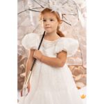 μανίκι-μπαλούν και η φούστα με το εντυπωσιακό βολάν δίνουν κίνηση και χάρη, ενώ το παιχνίδι με τις