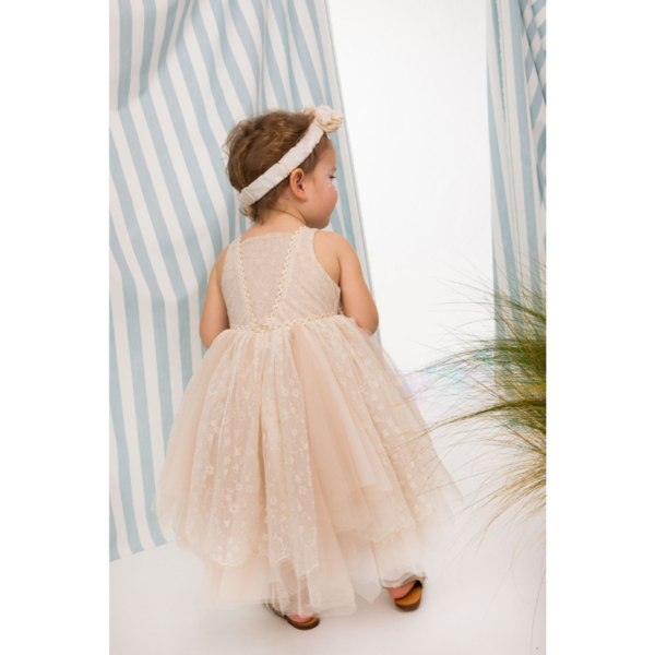 - Nude φόρεμα με layering φύλλων από εκρού και nude τούλι με κεντημένη δαντέλα με μαργαρίτες και ιριδίζον χρυσή πλέξη για λάμψη. Ημιδιάφανο μπούστο με V σχέδιο στολισμένο από μοτίφ λουλουδιών από οργάντζα και μικρές πέρλες.