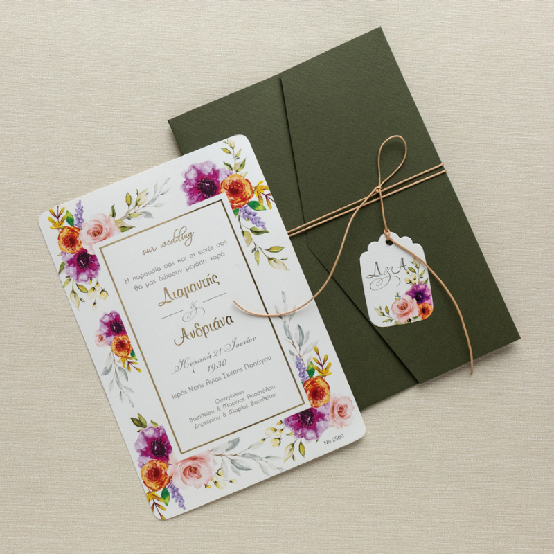Η τιμή χρέωσης αφορά το προσκλητήριο γάμου μαζί με τον φάκελο. Ο φάκελος έχει χρώμα κυπαρισσί κλείνει με καφέ κορδόνι και η κάρτα έχει φλοράλ σχεδίαση. Η διάσταση του προσκλητηρίου είναι 21×14,5cm. Ακολουθεί ο κατάλογος της εταιρίας σε περίπτωση που επιθυμείτε να αλλάξετε κείμενο ή γραμματοσειρά. Στείλτε μας με email τις αλλαγές που θέλετε. Δείτε τον κατάλογο της εταιρίας πατώντας εδώ Με την τοποθέτηση της παραγγελίας σας απαιτείται προκαταβολή 50% σε έναν από τους λογαριασμούς μας. Η εξόφληση μπορεί να γίνει είτε με αντικαταβολή (μέχρι του ποσού των 100€), είτε με εξόφληση σε τράπεζα, είτε με εξόφληση στο κατάστημα ΠΡΟΣΟΧΗ!!! Η μακέτα θα πρέπει να ελεγχθεί με μεγάλη προσοχή από εσάς για τυχόν ορθογραφικά λάθη, ημερομηνίες, ονόματα κτλ. καθώς μετά την έγκρισή της, τυχόν λάθος επιβαρύνει τον πελάτη και δεν είναι δική μας ευθύνη. Σε κάθε περίπτωση, η παραγγελία, οι διορθώσεις και η τελική έγκριση θα πρέπει να γίνονται μέσω μηνυμάτων ή email και όχι τηλεφωνικώς. Χρόνος προετοιμασίας των παραγγελιών για όλα τα προσκλητήρια είναι από 10 έως 15 εργάσιμες ημέρες από την έγκριση της μακέτας σας. Ελάχιστη παραγγελία 50 τμχ. Για μικρότερη ποσότητα υπάρχει επιπλέον χρέωση 30 €