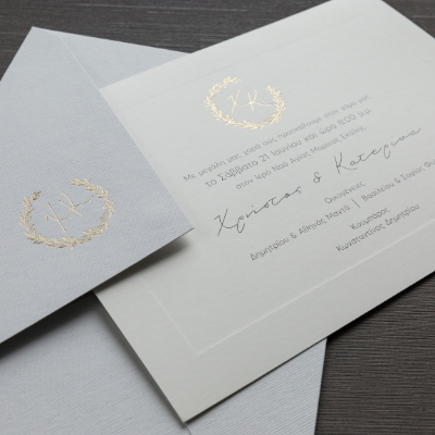 Προσκλητήριο γάμου με κάρτα σε χρώμα εκρού και φάκελο σε γκρι απόχρωση με ζαγρέ υφή. Το κλείσιμο του φακέλου γίνεται με βουλοκέρι. Το συγκεκριμένο προσκλητήριο έχει δυο επιλογές εκτύπωσης, χρυσοτυπία και απλή. Η διάσταση του είναι 21,5x15cm. Ακολουθεί ο κατάλογος της εταιρίας σε περίπτωση που επιθυμείτε να αλλάξετε κείμενο ή γραμματοσειρά. Στείλτε μας με email τις αλλαγές που θέλετε. Δείτε τον κατάλογο της εταιρίας πατώντας εδώ Με την τοποθέτηση της παραγγελίας σας απαιτείται προκαταβολή 50% σε έναν από τους λογαριασμούς μας. Η εξόφληση μπορεί να γίνει είτε με αντικαταβολή (μέχρι του ποσού των 100€), είτε με εξόφληση σε τράπεζα, είτε με εξόφληση στο κατάστημα ΠΡΟΣΟΧΗ!!! Η μακέτα θα πρέπει να ελεγχθεί με μεγάλη προσοχή από εσάς για τυχόν ορθογραφικά λάθη, ημερομηνίες, ονόματα κτλ. καθώς μετά την έγκρισή της, τυχόν λάθος επιβαρύνει τον πελάτη και δεν είναι δική μας ευθύνη. Σε κάθε περίπτωση, η παραγγελία, οι διορθώσεις και η τελική έγκριση θα πρέπει να γίνονται μέσω μηνυμάτων ή email και όχι τηλεφωνικώς. Χρόνος προετοιμασίας των παραγγελιών για όλα τα προσκλητήρια είναι από 10 έως 15 εργάσιμες ημέρες από την έγκριση της μακέτας σας. Ελάχιστη παραγγελία 50 τμχ. Για μικρότερη ποσότητα υπάρχει επιπλέον χρέωση 30 €