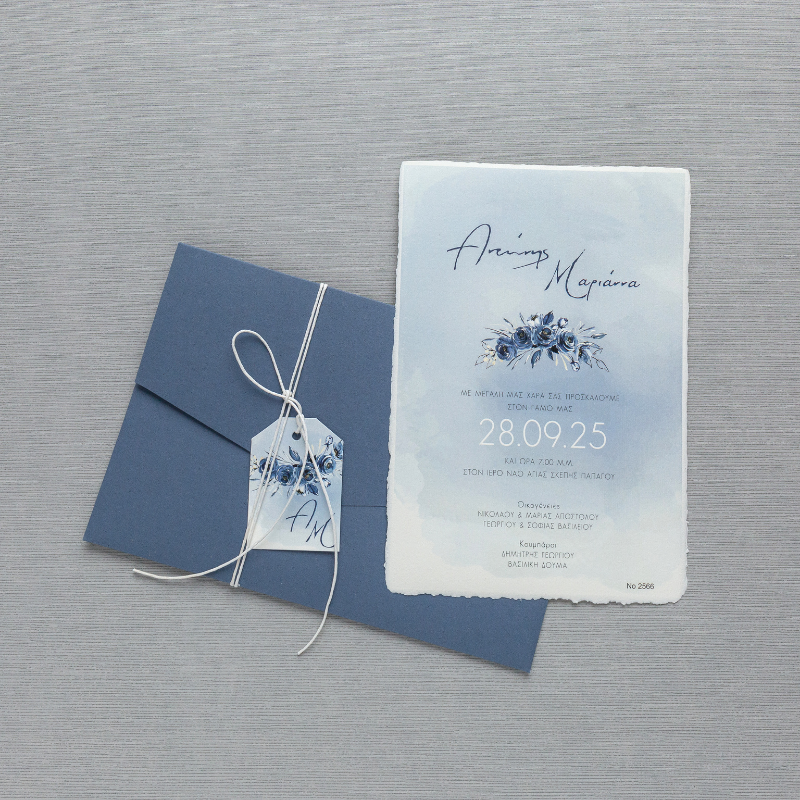 Το προσκλητήριο περιλαμβάνει δέσιμο και εξωτερικό χαρτάκι. Ο φάκελος του είναι μπλε. Το υλικό κατασκευής του mat χαρτί όπως επίσης και η κάρτα που βρίσκεται στο εσωτερικό του. Δένει όμορφα με μπεζ κορδόνι. Διάσταση: 22 x 15 cm Ακολουθεί ο κατάλογος της εταιρίας σε περίπτωση που επιθυμείτε να αλλάξετε κείμενο ή γραμματοσειρά. Στείλτε μας με email τις αλλαγές που θέλετε. Δείτε τον κατάλογο της εταιρίας πατώντας εδώ Με την τοποθέτηση της παραγγελίας σας απαιτείται προκαταβολή 50% σε έναν από τους λογαριασμούς μας. Η εξόφληση μπορεί να γίνει είτε με αντικαταβολή (μέχρι του ποσού των 100€), είτε με εξόφληση σε τράπεζα, είτε με εξόφληση στο κατάστημα ΠΡΟΣΟΧΗ!!! Η μακέτα θα πρέπει να ελεγχθεί με μεγάλη προσοχή από εσάς για τυχόν ορθογραφικά λάθη, ημερομηνίες, ονόματα κτλ. καθώς μετά την έγκρισή της, τυχόν λάθος επιβαρύνει τον πελάτη και δεν είναι δική μας ευθύνη. Σε κάθε περίπτωση, η παραγγελία, οι διορθώσεις και η τελική έγκριση θα πρέπει να γίνονται μέσω μηνυμάτων ή email και όχι τηλεφωνικώς. Χρόνος προετοιμασίας των παραγγελιών για όλα τα προσκλητήρια είναι από 10 έως 15 εργάσιμες ημέρες από την έγκριση της μακέτας σας. Ελάχιστη παραγγελία 50 τμχ. Για μικρότερη ποσότητα υπάρχει επιπλέον χρέωση 30 €