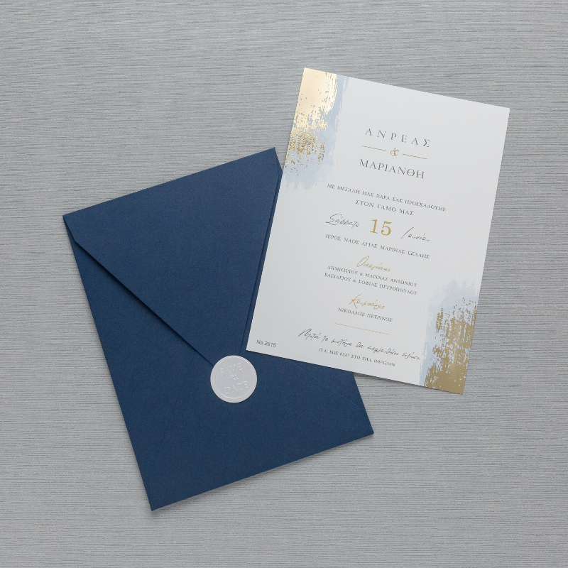Ένα εντυπωσιακό προσκλητήριο που κλείνει με βουλοκέρι σε χάρτινη μορφή. Ο φάκελος έχει χρώμα μπλε και η κάρτα του εκρού. Ένας εξαιρετικός συνδυασμός αποχρώσεων με δυνατότητα επιλογής σε χρυσοτυπία ή απλή εκτύπωση. Η διάσταση του προσκλητηρίου είναι 20,5 x 15cm. Ακολουθεί ο κατάλογος της εταιρίας σε περίπτωση που επιθυμείτε να αλλάξετε κείμενο ή γραμματοσειρά. Στείλτε μας με email τις αλλαγές που θέλετε. Δείτε τον κατάλογο της εταιρίας πατώντας εδώ Με την τοποθέτηση της παραγγελίας σας απαιτείται προκαταβολή 50% σε έναν από τους λογαριασμούς μας. Η εξόφληση μπορεί να γίνει είτε με αντικαταβολή (μέχρι του ποσού των 100€), είτε με εξόφληση σε τράπεζα, είτε με εξόφληση στο κατάστημα ΠΡΟΣΟΧΗ!!! Η μακέτα θα πρέπει να ελεγχθεί με μεγάλη προσοχή από εσάς για τυχόν ορθογραφικά λάθη, ημερομηνίες, ονόματα κτλ. καθώς μετά την έγκρισή της, τυχόν λάθος επιβαρύνει τον πελάτη και δεν είναι δική μας ευθύνη. Σε κάθε περίπτωση, η παραγγελία, οι διορθώσεις και η τελική έγκριση θα πρέπει να γίνονται μέσω μηνυμάτων ή email και όχι τηλεφωνικώς. Χρόνος προετοιμασίας των παραγγελιών για όλα τα προσκλητήρια είναι από 10 έως 15 εργάσιμες ημέρες από την έγκριση της μακέτας σας. Ελάχιστη παραγγελία 50 τμχ. Για μικρότερη ποσότητα υπάρχει επιπλέον χρέωση 30 €